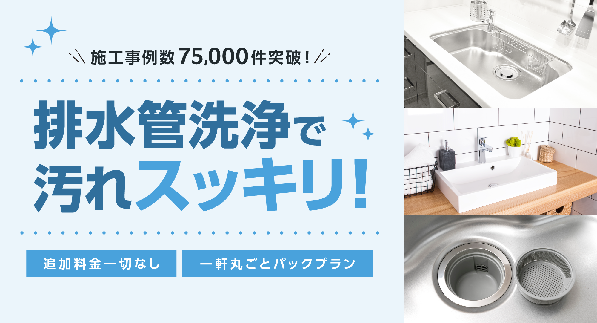 以前排水管洗浄をしたときから日が経ったので、安い会社を探しWEB割キャンペーンで依頼。外だけでなく家の中からも掃除してくれて、お風呂場のちょっとしたところもすぐ直してくれました。丁寧な方だったのでお任せして良かったです。次もお願いします。